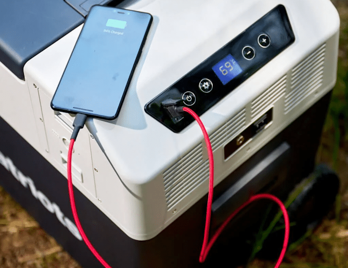 In addition, the Solar Go-Fridge’s also integrates a USB-C output port (located directly at the left side of its Power button) which, by drawing power from its internal battery, allows the cooler to also work as a power bank for recharging your devices.