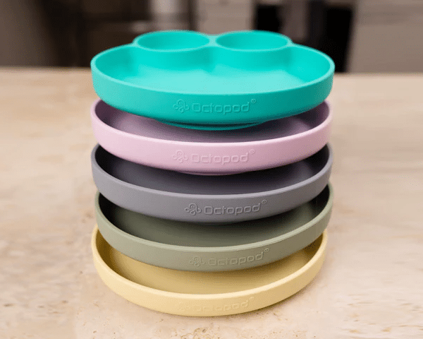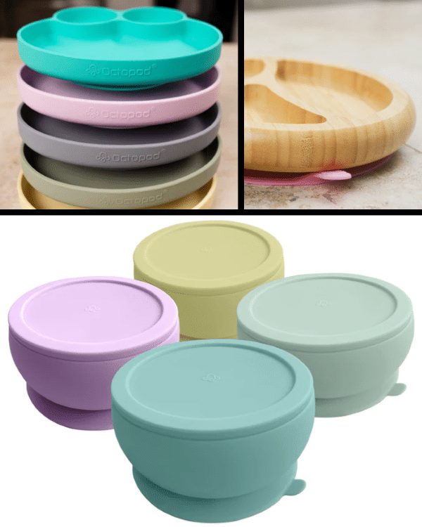 The Abiie Octopod Baby Dishware are eating plates and bowls for babies made entirely of silicone (or alternatively wood) which are designed to work on flat surfaces, featuring a built-in suction cup that ensures your baby’s dish stays on the table, plus separate food compartments that help keep your baby’s meals neatly arranged and ultimately easier to eat.