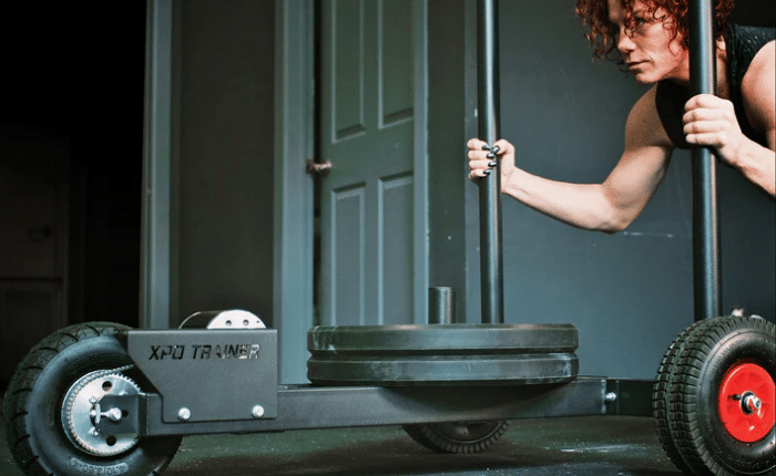 The Armored Fitness Equipment XPO Trainer 2 is a wheeled push sled for workouts equipped with a set of 3 ultra-durable built-in rubber wheels which work based on a resistance chain and resistance motor system that makes it exponentially harder to push the faster you go, all while featuring a nearly-silent operation.
