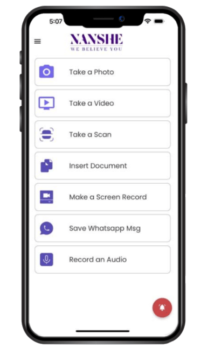 Via the NanShe App, victims of violence can securely pre-establish digital proof that they were or are still being the victim of abuse in the form of digitally-certified files, which can be transcriptions of texts and/or emails, evidence of photographs and videos, scans of digital documents, screenshots of a user’s mobile device screen, exports of WhatsApp chats, and also audio recordings.