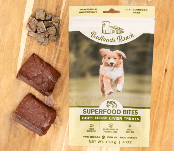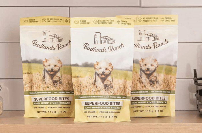 Their Badlands Ranch Superfood Bites are doggy treats made with one single freeze-dried ingredient, which can be either premium freeze-dried raw beef liver, freeze-dried chicken breast, or freeze-dried wild caught salmon.