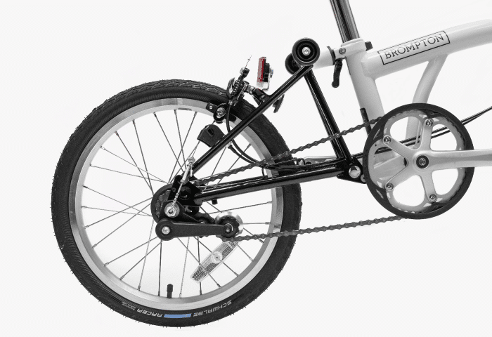 For the bike’s rear-wheel, we have a double-wall rim, 28 spoke, Brompton Standard ratio 3 speed internal gear hub, 13 tooth sprocket wheel.
