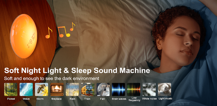 In addition, this smart sleep sunrise alarm clock is also designed to work as a natural white-noise machine, for which it features 11 relaxing natural white noises that contain Alpha brainwave sound effects which can help you relax, fall asleep, effectively calm you down and reduce anxiety, and also help you meditate by soothing you into a relaxed state of mind, along with 5 natural-recorded alarm sounds for waking up relaxed.