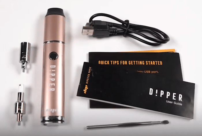 Inside their package, users will find: their Dip Devices Dipper, along with its Vapor Tip Atomizer, Quartz Crystal Atomizer, reclaim chamber, mouthpiece, a micro-USB charging cable and a user manual.