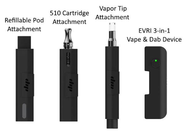Inside each package users will find: their Dip Devices EVRI multi-functional concentrate vaporizer, one (x1) included Vapor Tip Attachment Accessory, one (x1) included Dual-Sided Accessory (with a 510 Cartridge Attachment on one side and a Refillable Pod Attachment on the other side), and the unit’s proprietary Micro-USB Charging Cable.