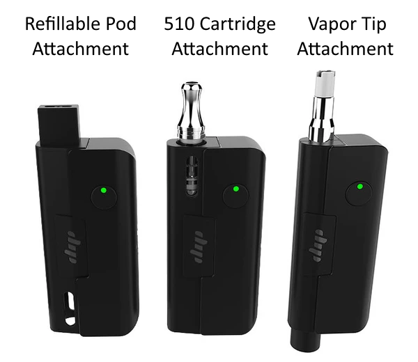 This multi-functional concentrate vaporizer includes a Vapor Tip Attachment that allows the consumption of your choice of concentrate directly from its container, as well as dual-sided Accessory that on one side features a 510 Cartridge Attachment that can be connected to 510 cartridges, while on its other side features a Refillable Pod Attachment that can be connected to refillable e-juice pods.
