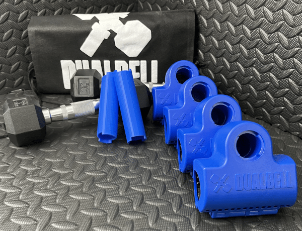 What’s more is that the company’s Dualbell full workout set (called The Complete Dualbell Superset) also comes together with a set of interlocking spacers that allows two (x2) Dualbell units to be connected and used together on one side of your barbell by keeping both units (and the dumbbells they’re holding) in place and perfectly parallel to each other.