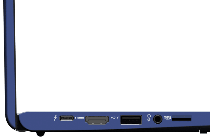 Then on the laptop’s left side, we have another USB-C port with Thunderbolt 4 support, an HDMI output port, another USB-A 3.2 Gen 1 port, a 3.5mm headset jack to which you can connect a pair of headphones with or without a built-in microphone, and a microSD card slot.