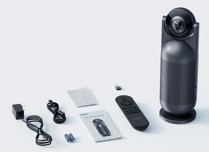 Inside their package, users will find: their EMEET Meeting Capsule, the device’s dedicated 3m (9.84 ft.) USB-C Connection Cable plus an included USB C to USB-A Adapter (for computers or laptops that don’t have a USB-C port available), along with the device’s dedicated Power Supply Adapter and Cable, as well as an included Remote Control and a set of batteries for it, a User Manual, and a Safety Guide.