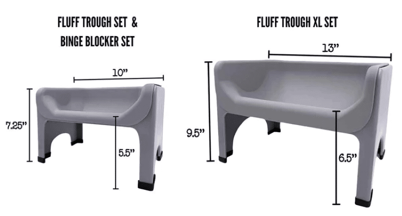 For pet owners that require to add height to their pet’s Fluff Trough (whether that’s the small model or even the XL model), know that the company also sells the Stackable Fluff Trough Lift Kit, which are sets of adjustable height leg extensions which can be used to raise the Fluff Trough’s feeding bowl insert higher.