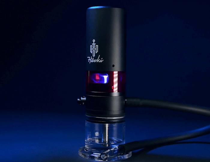 Inside their package, users will find: their Hitoki Trident V3 Laser Device, along with the device’s magnetic glass water base, its ceramic chamber, a poker tool (for loading its chamber), either a hookah hose or a bong-style hose, a hose connector, a USB-C charging cable and power adapter, and an instruction manual.