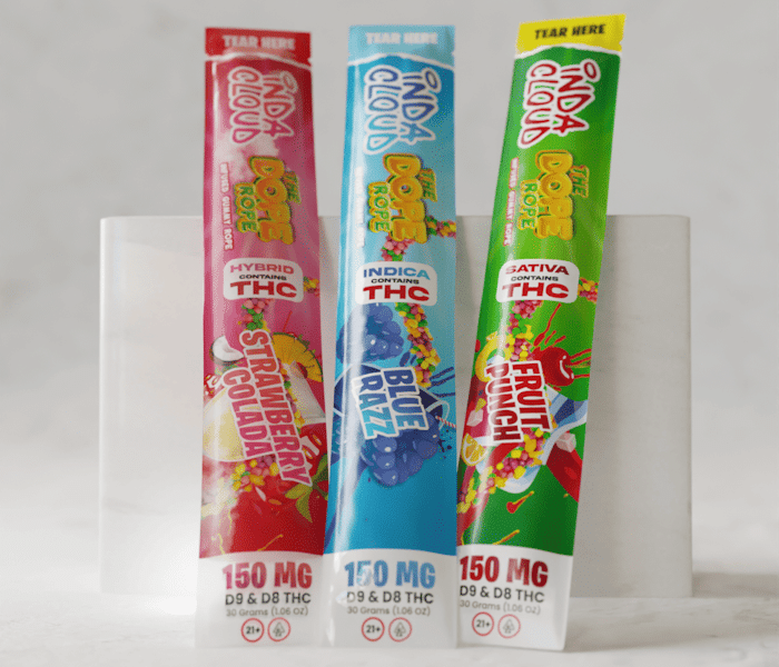 IndaCloud’s Dope Rope THC Gummy is available in three flavor signature flavors: Fruit Punch (sativa), Strawberry Colada (hybrid), and Blue Razz (indica).