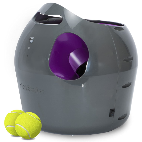 The PetSafe Automatic Ball Launcher is an electronic interactive fetch system for dogs that features Customizable Launch Settings for launching anywhere between 8-30 feet, Motion Sensor Safety to protect your dog when in front of the launching area, an Automatic Sleep Mode that prevents dogs from over-exercising , and also Audible Training Tones.
