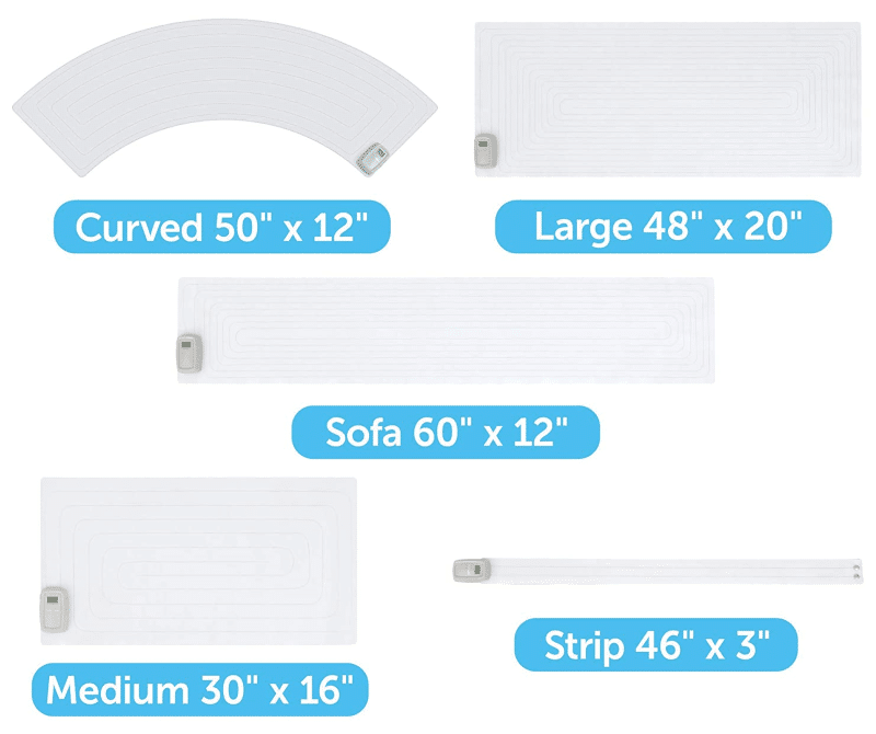 Starting with the unit’s size, know that the PetSafe ScatMat is currently available in five (x5) different sizing options, thus allowing pet owners to more easily protected different-sized off-limit areas within their home and ultimately teach their pets to stay away from / not climb onto those.