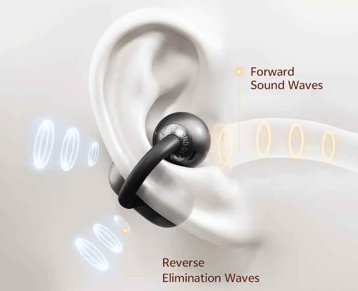 Lastly, these open-ear wireless earbuds can also be used for performing voice calls with enhanced clarity. Each earbud integrates an array of four AI-powered beamforming microphones that feature wind noise reduction to filter out unwanted gusts of wind during phone calls, along with ambient noise reduction, which provides up to 45dB of noise cancellation for unwanted background sounds.