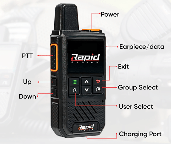 Lastly, integrated at the right side of each radio there’s also an earpiece and data ports (a microphone and speaker ports) that enable you to connect earbuds, hand mics, and other accessories to the radio. (Rapid Radios also sells a headset that works with all of their radios – does not use Bluetooth for privacy reasons).