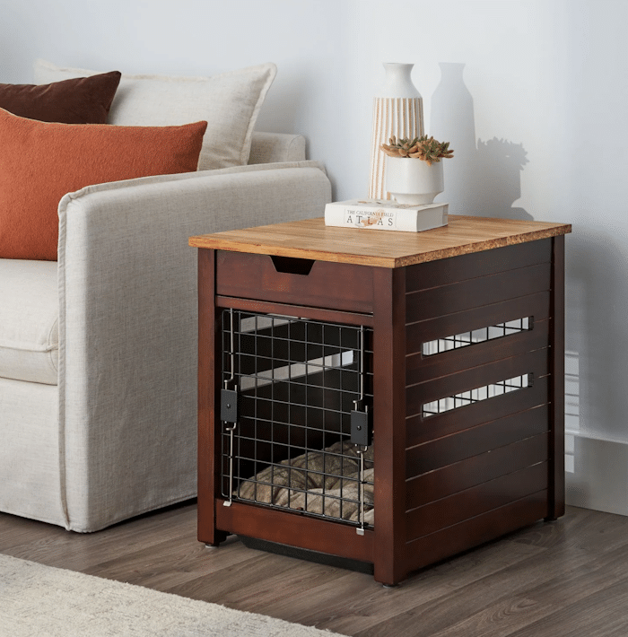 Designed with both dog owners and their pups in mind, this dual-purpose dog crate and side table combines pet comfort and home décor into a single furniture piece, making it an elegant solution for dog owners looking to streamline their living space needs.