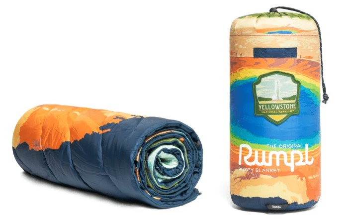 Now, when it comes to its design, for our review unit of the Rumpl Original Puffy Blanket, we’ve gone with the Yellowstone Print model, which features a gorgeous, cheerful, and super-colorful print of the renowned Yellowstone National Park, which was in fact America’s first National Park in history.