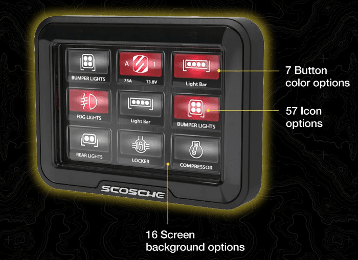 The Scosche M8RIX is a power distribution management system used for controlling up to 8 electrically-powered accessories installed on any vehicle, which is rated to have a IPX7 Waterproof Rating, featuring 8 MOSFET power outputs including 2 30A outputs, 2 15A outputs, and 4 10A outputs that boast 130Amps of combined Power Output, plus a 3.5″ programmable LCD touchscreen control panel with dimmable illumination that can be mounted easily onto your vehicle’s dashboard and features eight channels, for which users can customize the visual of the touch control buttons for each of those channels by choosing from 57 different icons, 7 different icon colors, and 16 different background colors.