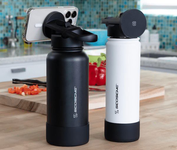 The Scosche MagicMount Hydro is a high-end multi-functional water bottle that features a double-wall vacuum insulation that helps to maintain the temperature of your beverage, plus a leak-proof cap equipped with a quick flip straw for easily quenching your thirst with no mess, while also integrating a built-in adjustable magnetic phone mount that can hold MagSafe-compatible devices thanks to its compatibility with Apple’s MagSafe Charger, as well as non-MagSafe iPhone models and all Android phones by using the included MagicRing Adapter, along with a detachable anti-slip base made of BPA-free food-grade silicone gel that can also be used as a dog water bowl.