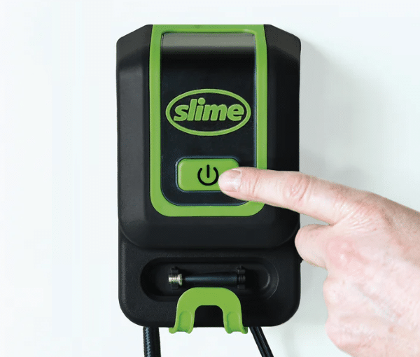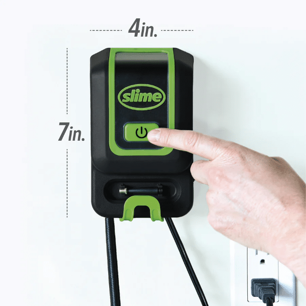 The Slime Garage Inflation Station is an electric-powered 120V inflator that can be mounted onto your garage wall which is powerful enough to provide between 0 to 60 PSI of air pressure, all while also featuring an extra-long 20 ft. coil hose, a built-in Dial Display that’s easy to read and conveniently shows the device’s current PSI output, as well as an integrated Tire Sensor that safely detects when a tire is reaching its maximum air capacity, plus an included set of multi-purpose air adapter heads that can be attached to its air nozzle for inflating any other inflatables such as a ball or an inflatable item.