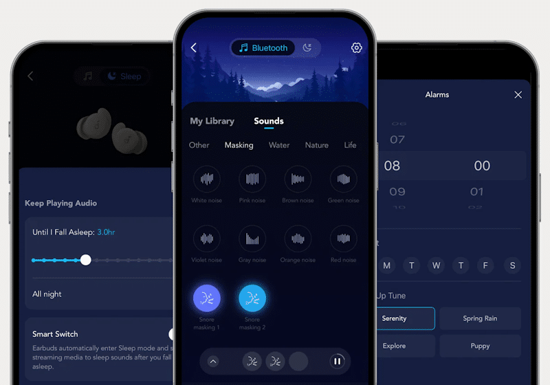 After pairing the earbuds with your smartphone, simply perform a double tap on either earbud to swap from Bluetooth Mode to Sleep Mode and automatically play the pre-loaded sleep sounds. Double tapping once again swaps back to Bluetooth Mode.