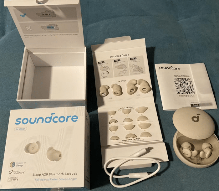 Inside their package, users will find: the Soundcore Sleep A20 Sleep Earbuds, their wireless charging case, along with three pairs of ear wings, four pairs of sealed ear tips, three pairs of breathable ear tips, a USB-C charging cable, and a user manual.