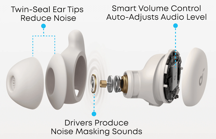 For blocking out noise, the Soundcore Sleep A20 Sleep Earbuds leverage a 4-Point Noise Masking System that utilizes Twin-Seal ear tips to prevent unwanted noise, which offer 3x stronger Passive Noise Blocking in comparison to single-layer ear tips from lower-end sleep earbud models on the market.
