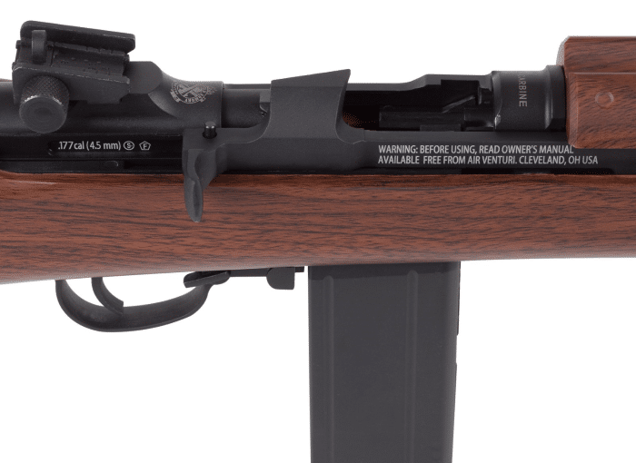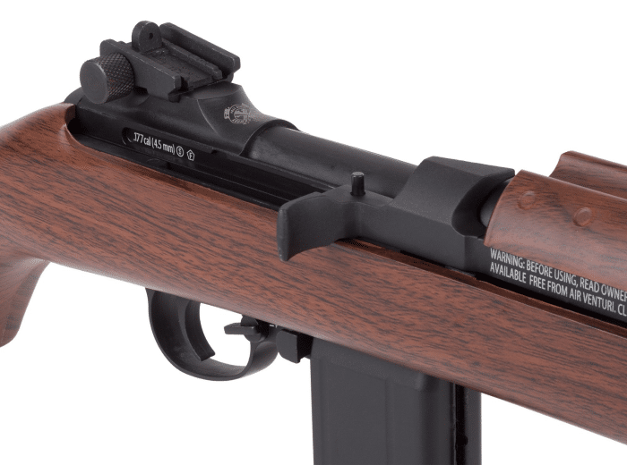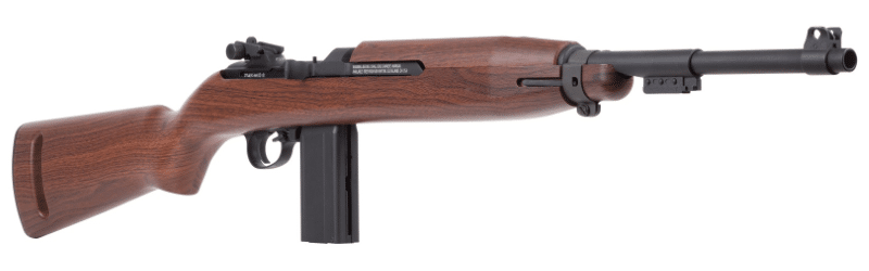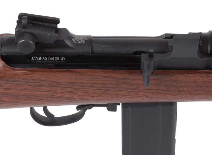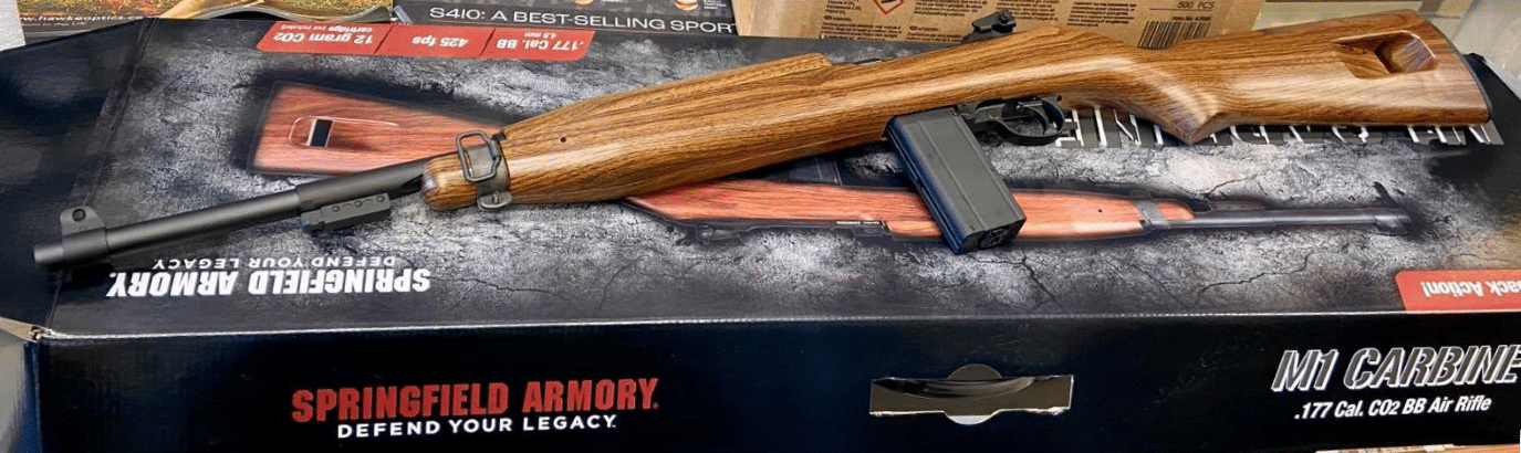 The Springfield Armory M1 Carbine is a blowback CO2-powered .177 caliber semi-automatic BB repeater rifle that operates off of a single 12-gram CO2 cartridge held in a 15 round drop-free magazine, featuring a two-stage trigger, a built-in Manual Safety, a Windage-adjustable rear sight, and the capability of shooting 40 shots per cartridge with bullet-speeds reaching up to 425 fps for each shot taken.