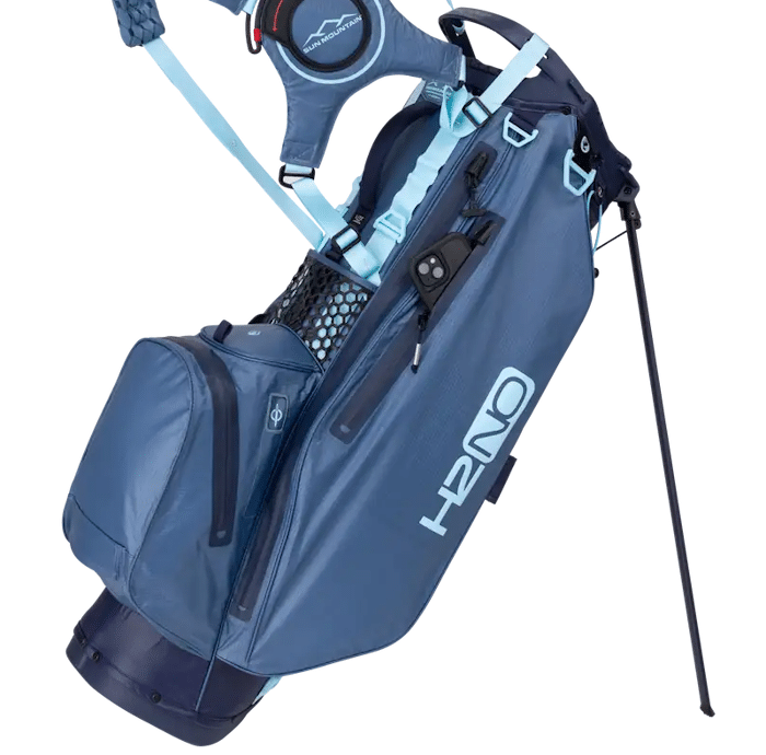 The Sun Mountain H2NO Lite 14-Way Stand Bag is a lightweight, full-featured waterproof golf stand bag which features a waterproof construction, a top-mounted roller-bottom leg mechanism and a Velcro leg lock system, and an E-Z Lite Dual Strap System with thick foam carry straps that make it easy to get on and off and comfortable to carry. It also integrates a spacious top compartment with 14 individual full-length box dividers for storing your clubs, plus seven pockets including a full-length apparel pocket, a cooler pocket with magnetic closure, dual velour-lined valuables pockets for storing your personal items, and multiple accessory pockets.