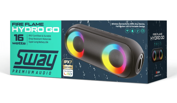 Designed to integrate all of the latest functionalities you’d like to have in a portable wireless speaker, the SWAY Fire Flame Hydro Go not only packs a punch with its impressive audio output, but also integrates the latest in full motion LED technology, and even has a long-lasting battery life that allows for almost an entire day of audio playback.