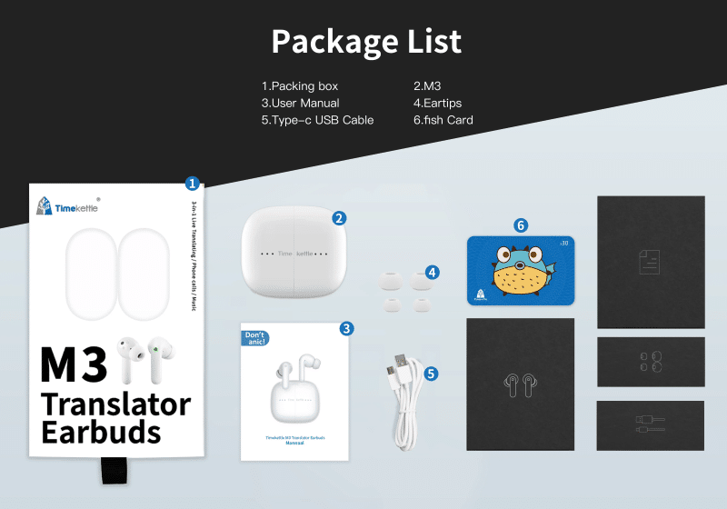 Inside each package, users will find: their Timekettle M3 Language Translator Earbuds, the earbuds’ wireless charging case, 3 sets of removable silicone earbud covers, the case’s USB-C Charging Cable, a Fish Card valued at 30 Coins for the earbuds’ Offline Translation language packs, and a User Manual.
