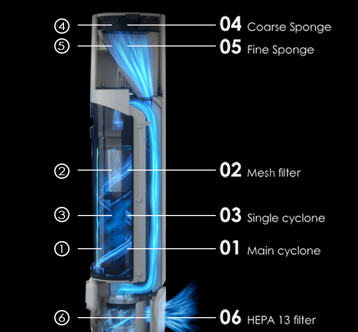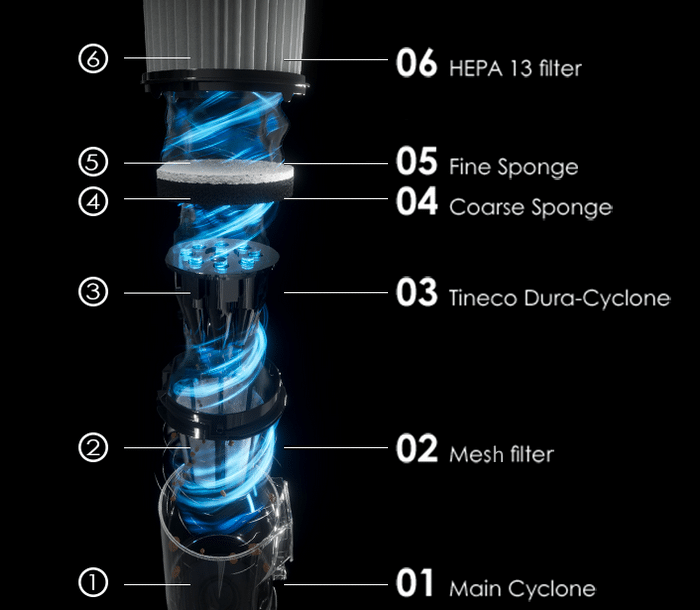 Moving on to the vacuum’s different components. To ensure a thorough and efficient cleaning, the Tineco Pure ONE Station 5 comes equipped with an advanced 6-Stage HEPA Filtration System that’s composed by a main cyclone, followed by a mesh filter, which is then followed by a proprietary Dura-cyclone System, then by a coarse sponge and a fine sponge, and finally by a HEPA 13 filter.