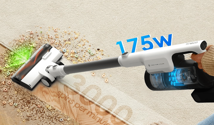 For powering its vacuuming function, the Tineco Pure ONE Station 5 leverages a powerful brushless motor operating at 3.000 RPM that makes the vacuum capable of delivering powerful suction up to 175W.