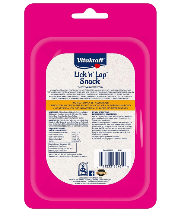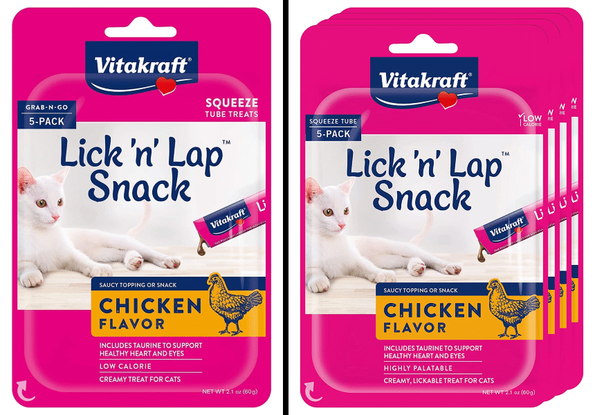 Lastly, note that that the Vitakraft Lick ‘n’ Lap Snacks should be served at room temperature.