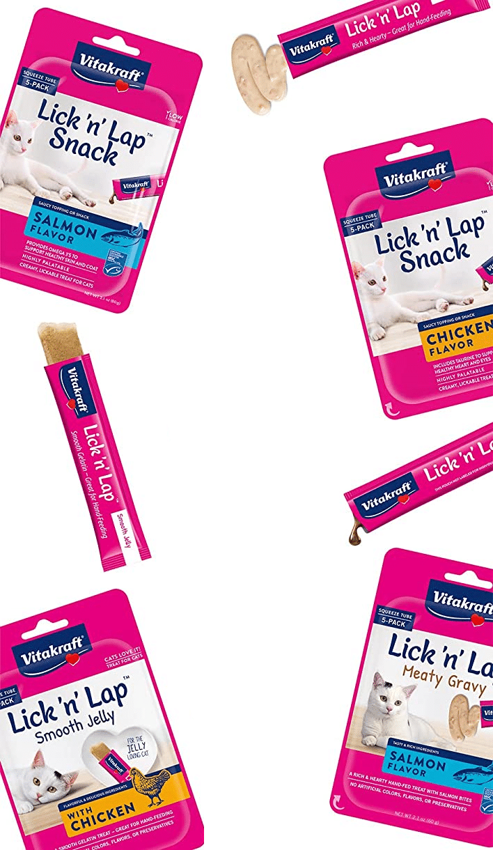 Now, let’s talk a little more about the Vitakraft Lick ‘n’ Lap Snacks, go over the ingredients that are used to make these lickable low-calorie creamy cat treats, talk about the different flavor and texture varieties that are currently available, and discuss their pricing options.