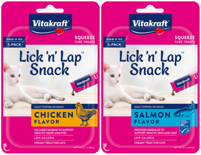 The original texture option is the Vitakraft Lick ‘n’ Lap Snack, which consists of lickable low-calorie cat treats that have a creamy texture. These are available in two (x2) different flavors, which are chicken and salmon.