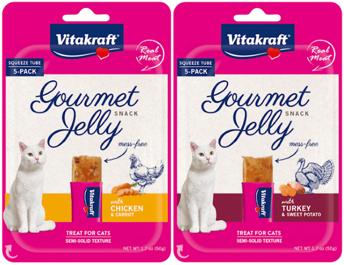 In addition, there’s also the Vitakraft Gourmet Jelly, which consist of appetizing gelatin cat snacks that have a semi-solid texture. These are available in two (x2) delicious special blends, which are chicken and carrots, or alternatively, turkey and sweet potato.