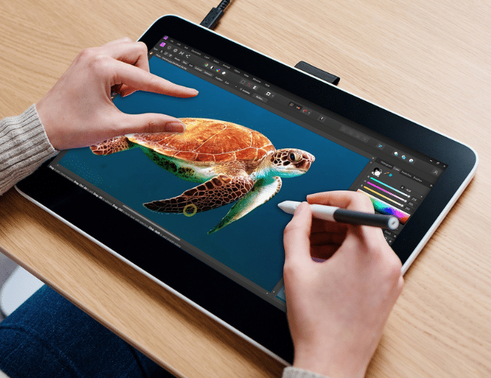 The Wacom One 13 touch is a high-end touch-sensitive drawing tablet featuring a 13.3″ FHD full-color laminated IPS touchscreen display that boasts a FHD 1080p resolution, while also having virtually no lag and no parallax, integrating both anti-glare and anti-fingerprint protection, and boasting support to multi-touch gesture controls. It also comes with a wireless battery-free ergonomic digital pen that’s powered by electromagnetic resonance (EMR) technology, boasting pressure sensitivity with 4096 levels of pressure and natural tilt support for more precision and control while drawing or taking notes with it, while also integrating 2 programmable buttons for configuring shortcuts. The table also integrates built-in buttons for its power and settings, a toggle switch for enabling and disabling its touch functions, and 2 USB-C ports for connecting it to another device. It boasts compatibility with Windows PCs, Mac PCs, Chromebook devices, and Android smartphones. The tablet also includes the Wacom Adventure program, which includes a collection of creative and education software applications, online training, and engaging content to help you learn new techniques and improve your digital drawing skills.