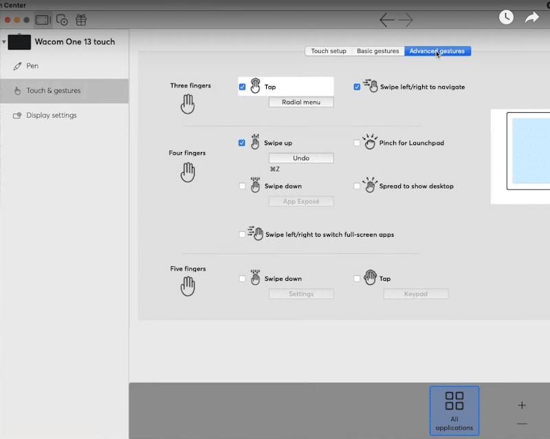Users can also configure specific actions for three-finger, four-finger, and five-finger tapping actions.