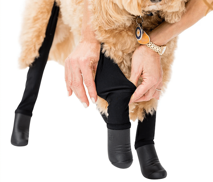 Moving on to their construction. These all-in-one dog boot leggings feature an innovative and super-simple “Easy-On” design that has no elastic drawstring leg openings whatsoever. Instead, it only has wide leg openings and smooth seams, which essentially help ensure nails don’t get caught, ultimately making it super easy for dog owners to slip them on their dog’s legs and just as easy to take them off after returning home from a dog walk with their pup.