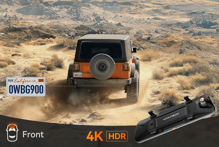 The dash cam comes pre-installed with a 256GB SD card for video storage (expandable to 512GB), integrates a 12″ touchscreen mirror that displays all three camera perspectives, boasts built-in GPS for GPS tracking your route and location, and supports 5.8GHz Wi-Fi connectivity. Via the WOLFBOX App, you can enable live view of its three camera perspectives, review past recordings, and download and share video footage. It also supports voice controls.