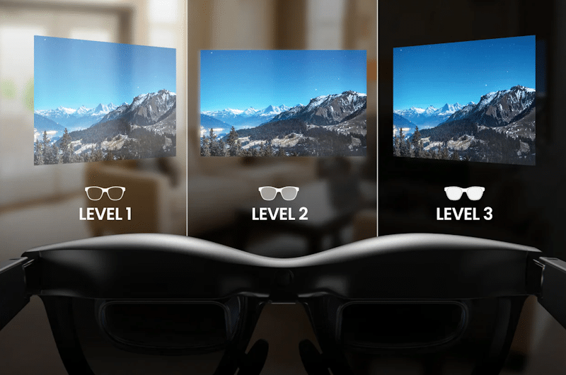 For controlling their operation, the XREAL Air 2 Pro come equipped with a one-touch immersion control button located at the top-front of the glasses’ right temple through which you’re offered three (x3) adjustable electrochromic dimming levels, including: