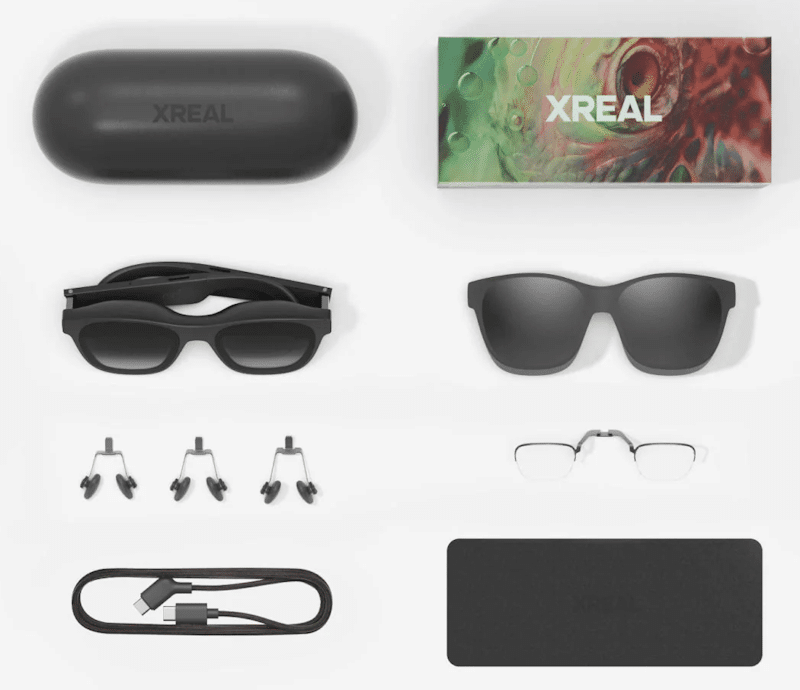 Inside their package, users will find: their XREAL Air 2 Pro AR Glasses, a light shield, a prescription lens frame, three pairs nose pads in different sizes, a USB-C charging cable, a travel case and cleaning cloth, plus a user manual.
