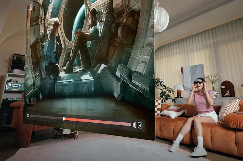The glasses can be worn indoors or outdoors under any lighting condition, are TÜV Rheinland Certified for eye comfort and low blue-light, offering flicker-free visuals, and can even be purchased with prescription lens inserts for users with myopia. They also offer three adjustable dimming levels via a one-touch immersion control button and can be connected to any device through a USB-C video output, including iPhones, Android smartphones, PCs, laptops, and gaming consoles. Pairing them with the XREAL Beam or Beam Pro unlocks a 3D spatial display with multiple viewing modes for millions of 2D apps.
